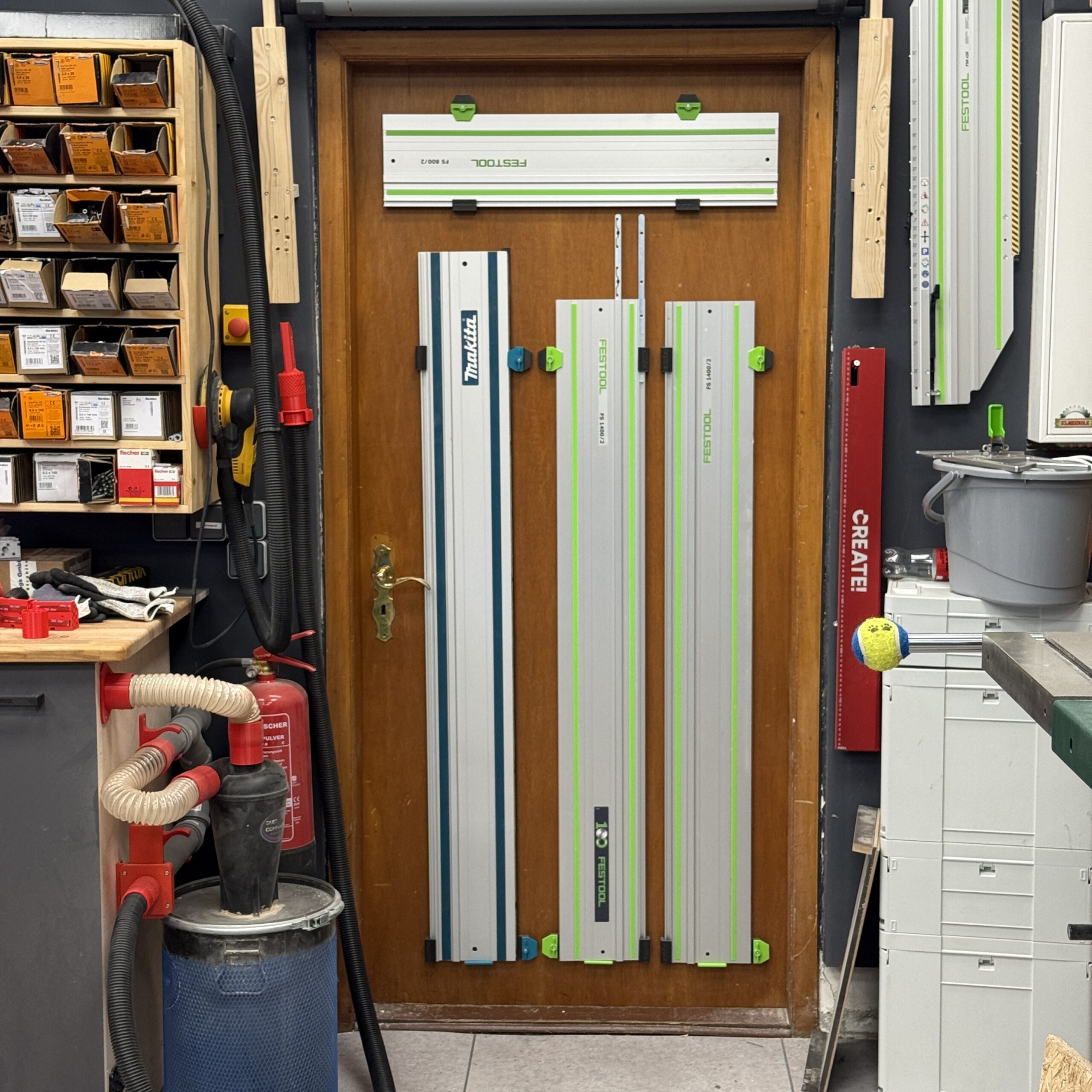 Die Führungsschienenhalter von Kleinholz sind die ideale Lösung, um deine Schienen übersichtlich, sicher und griffbereit in der Werkstatt zu lagern.