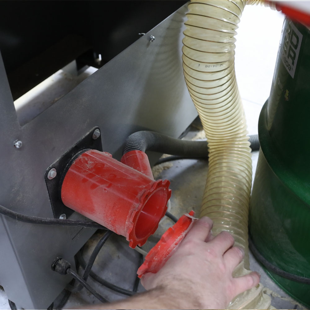 Dadurch können ggf. mehr Späne im inneren der Maschine entstehen, man hat aber DEUTLICH weniger Späne auf dem Maschinentisch. Das Reduzierstück kann bei Bedarf montiert oder weggelassen werden – je nach Absauganlage und Setup.