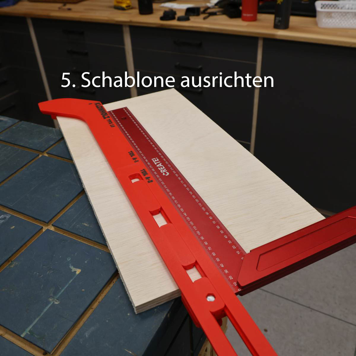 Es ist sicherzustellen, dass die Schablone fest und sicher befestigt wird. Da Bedienungsanweisungen des Herstellers der Oberfräse und Fräsers es folge zu leisten. Von Kindern fern halten.